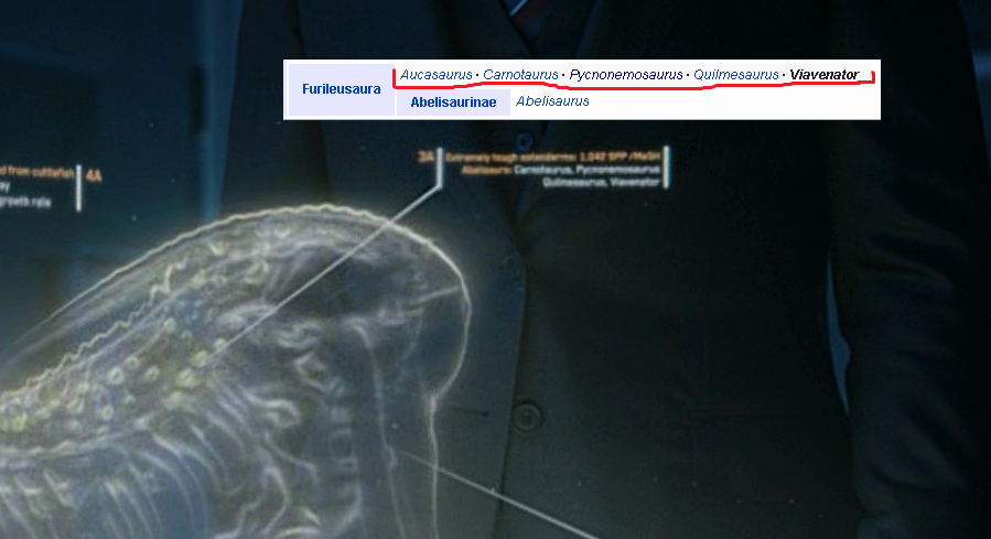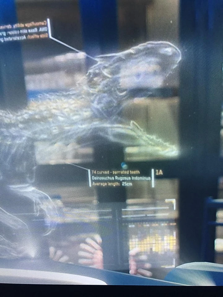 The hologram of the Indominus shows various animals added to its DNA, including various abelisaurs and even Deinosuchus, although I can't make out certain parts... Therizinosaurus might be in there, but I can't say for sure.Are you sure? I could've sworn Jack Horner or somebody said that's where it's long claws came from.